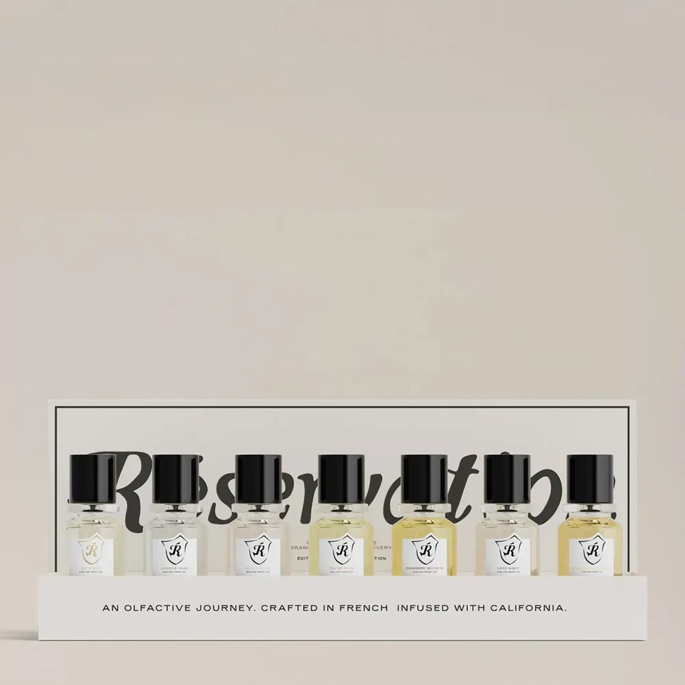 Reservation Eau de Parfum Miniature Set is a unisex mixed kit. An invitation to immerse oneself in a universe suspended between dream and reality, where every room holds a story and every corridor smells of adventure. Reservation’s **Eau de Parfum Miniature Set** is a collection of seven fragrances in 15 ml format, designed to evoke emotions and memories linked to an imaginary, legendary and timeless hotel. Suite 909, Jasmine Haze, Bleu Piscine, Feu de Rose, Chambre Secrète, Late Night and Riviera Californienne: each fragrance tells a fragment of this dreamlike world of secret encounters, illuminated nights and rarefied atmospheres. An exclusive box set for those who wish to explore the art of perfume as a sensory journey through imaginary places and unforgettable moments.